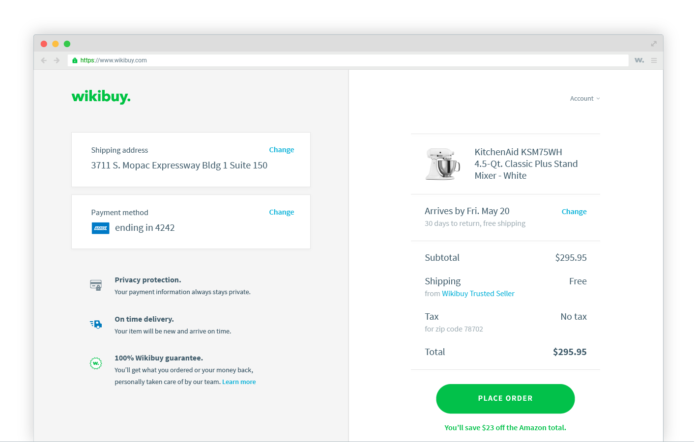 When there is a better price, the browser extension pops up to notify you. If the customer has already found the best price, comparable products at lower total prices may be offered. Wikibuy also acts as a singular checkout experience for any retailer, streamlining the experience. No matter where you buy, it's two clicks to check out with Wikibuy. If anything goes wrong, Wikibuy is on the hook to make it right.